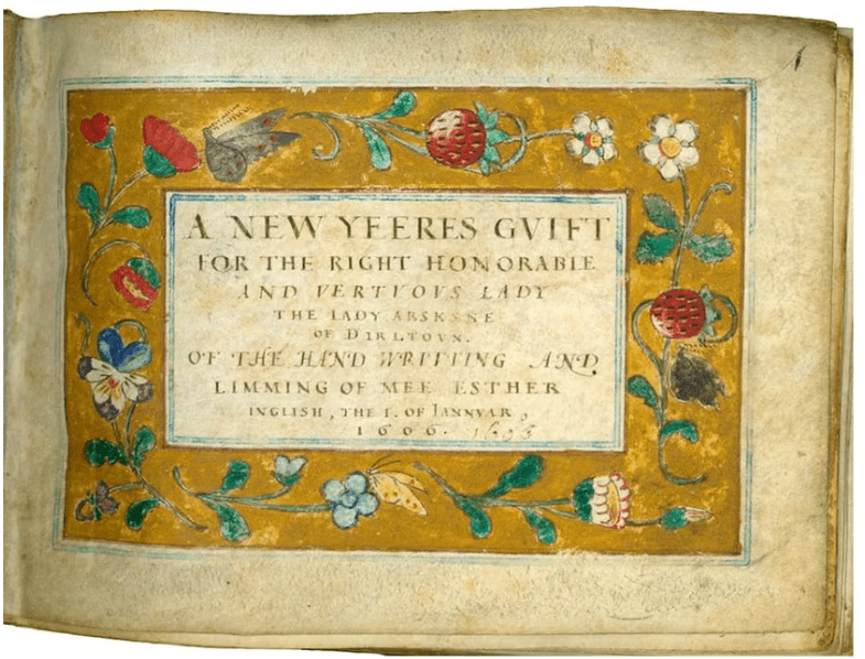 Esther and her family had arrived in London in mid-1604, following the Stewart court. While there, she began experimenting with new materials, working for the first time in full colour and even trying what it was like to paint on vellum. During 1605, in preparation for the following New Year, she made three manuscripts in this medium, which had been widely used in the medieval period, but was now mostly found in special legal and royal documents. The recipients were all connected to the court of James VI/I: Robert Sidney, Earl of Leicester (and younger brother of the lamented Sir Philip Sidney); Lucy Harington Russell, Countess of Bedford (and noted patron of the arts), and Elizabeth Norris, wife of Thomas Erskine, Lord Dirletoun. Elizabeth, whose manuscript is seen above, was one of the wealthy English widows who married a Scottish courtier, matches that were promoted by King James.