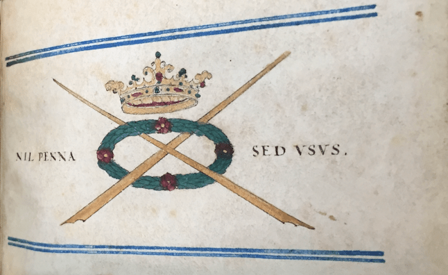 The similarities among these three manuscripts indicate that Esther was streamlining her work, no doubt necessitated by having an infant and three other children needing her attention. All three use texts from the Book of Proverbs. If you compare the title pages, you’ll see that she copies the same patterns of flowers, fruits and moths, and she repeats designs on interior pages as well. All three manuscripts also contain the crossed calligrapher’s pens with the motto Nil Penna Sed Usus (“not the pen itself, but the skill in using it”) which she adapted from a handwriting manual by Jacobus Hondius.